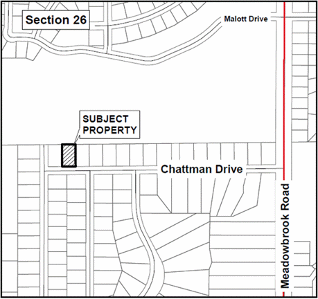 NOTICE IS HEREBY GIVEN that the Planning Commission for the City of Novi will hold a public hearing on Wednesday, January 14, 2026, at 7:00 P.M. in the Novi Civic Center, 45175 Ten Mile Road, Novi, MI to consider 41870 Chattman Drive, PBR25-0394 FOR A WOODLAND PERMIT. The subject property totals approximately 0.38 acres and is located west of Meadowbrook Road, north of Nine Mile Road (Section 26). The subject property is zoned R-3 (One-Family Residential). The applicant is requesting approval to remove 6 regulated woodland trees in order to build an addition to a single-family home.